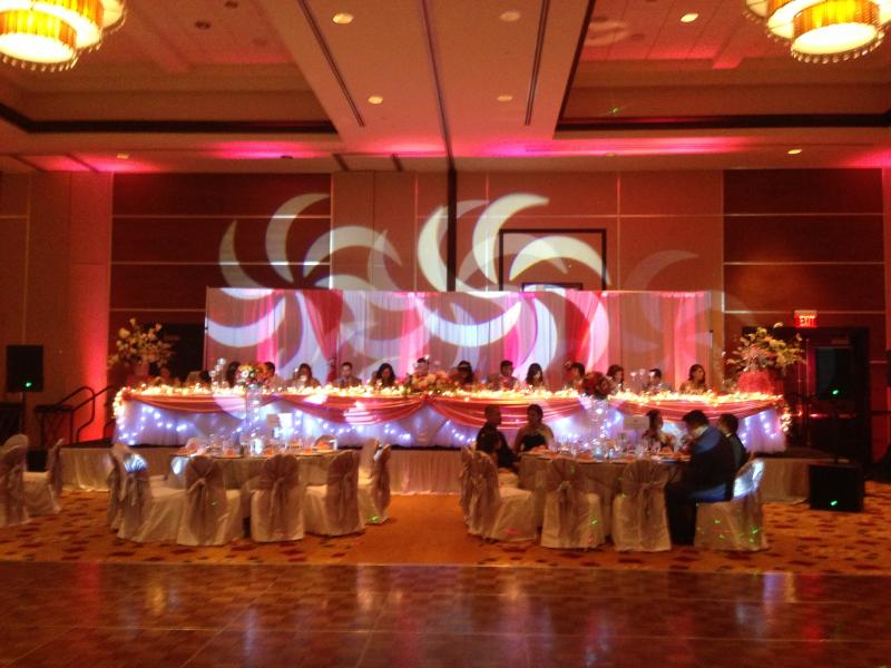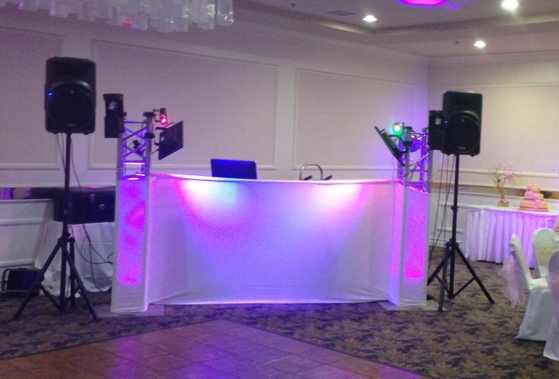 Our Spandex Dj Set ups are very unique! We have a very clean and modern look that blends into the theme of any hall decor and style. The color of the spandex can be programed to change to any specific color. Here is a choice color of Fusia pink which became brighter as lights are dimmed towards the end of the evening, which helps liven up the room.