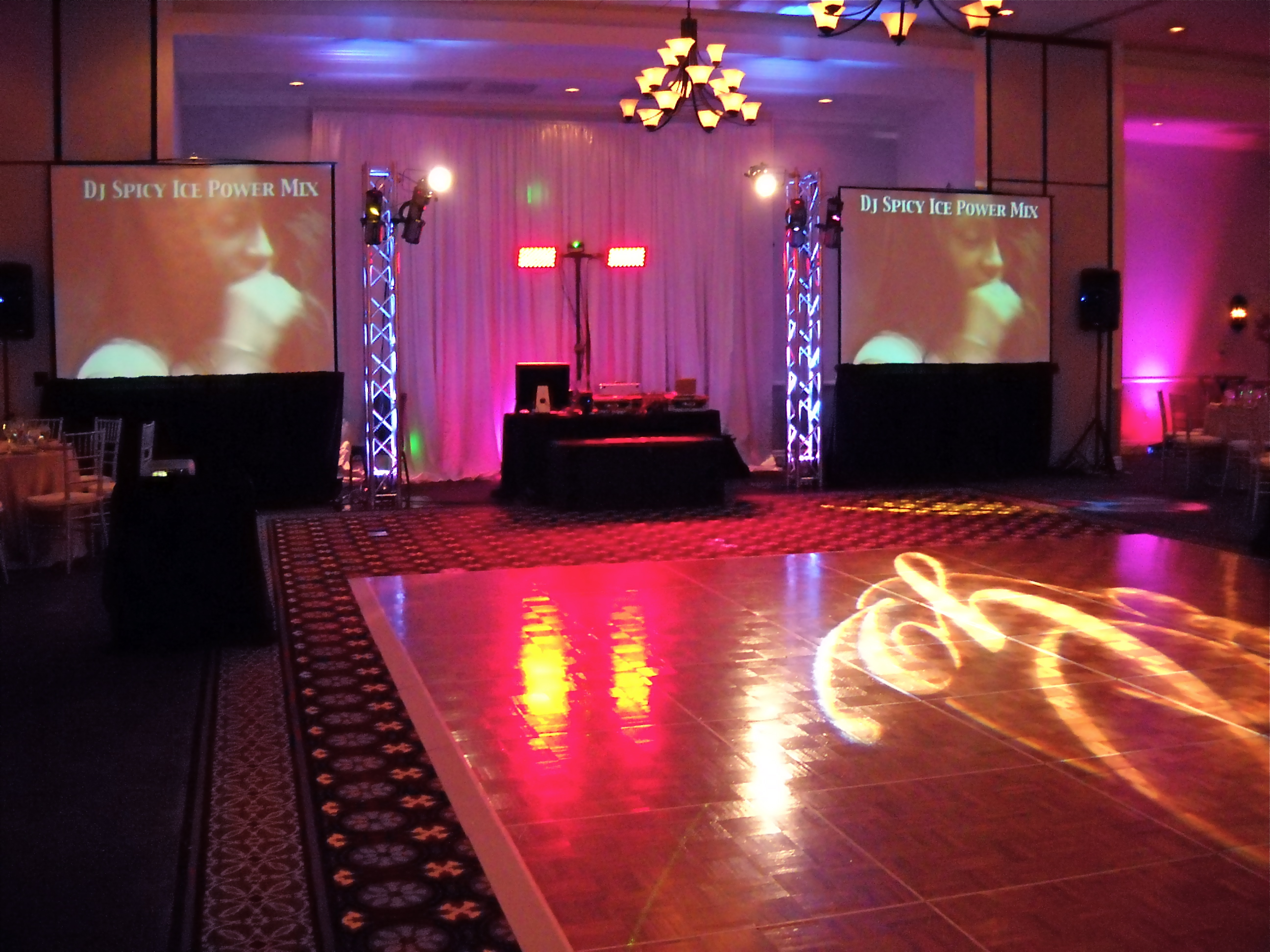 This is package as you can see the set up is more elaborate than the other packages why you ask? The double screens draped with all the emenities of package #3 and gobo light with your initials or name focused anywhere in the room you would like it to be placed. This is a grand package for up to 250/400 guest.